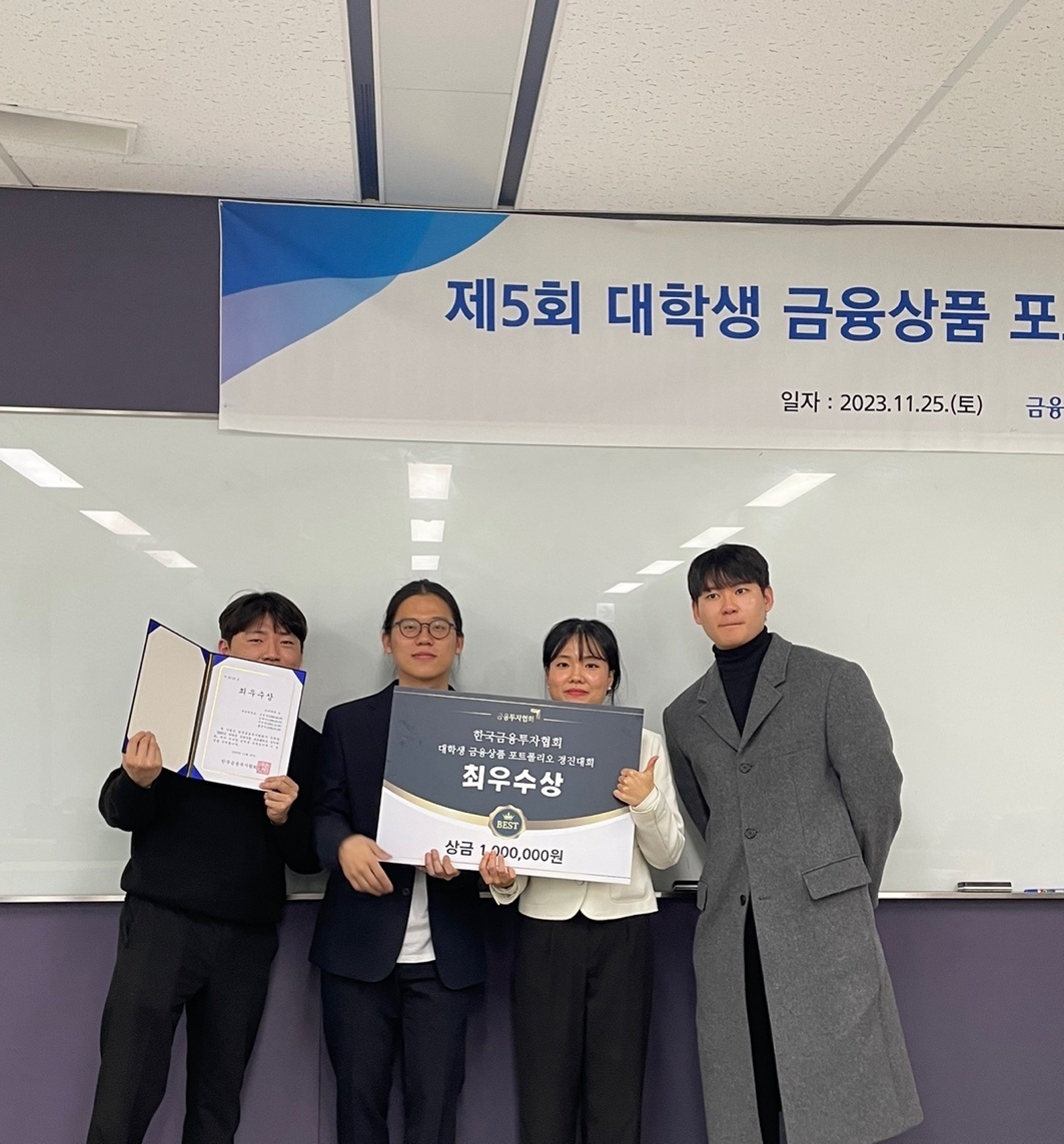 11월 25일 금융투자협회에서 개최된 제 5회 대학생 금융상품 포트폴리오 대회에서 경영학과 증권투자동아리 SMP 구성원들이 최우수상(1팀), 우수상(2팀)을 수상하였습니다.