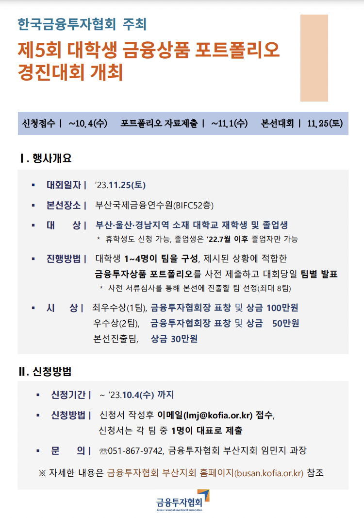 본 대회는 부울경 지역의 대학생들을 대상으로 진행되었으며 제시된 상황에 적합한 금융상품 포트폴리오를 만들어 발표하는 대회입니다.