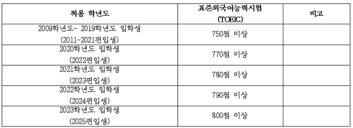2) 내국인 대상: 표준외국어능력시험(TOEIC) (입학 연도별 성적 기준 상이)