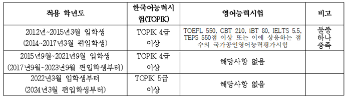 3) 외국인 대상: 한국어능력시험(TOPIK) (입학 연도별 성적 기준 상이)