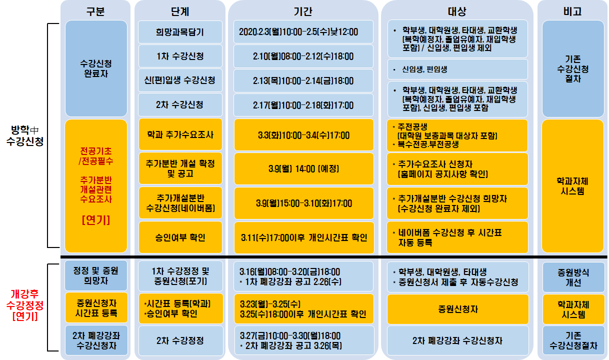 (변동사항) 신종 코로나바이러스 감염증 확산 대응을 위해 개강일이 2주 연기됨에 따라 경영학과 추가수요조사 및 증원신청 일정을 아래와 같이 변경하였으니 확인 바랍니다.