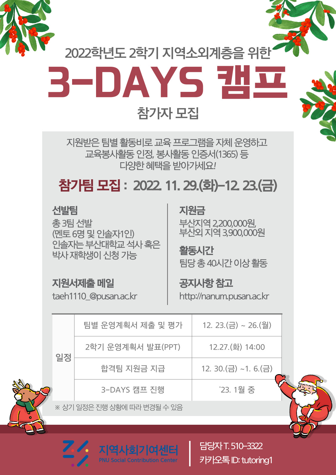 fnctId=bbs,fnctNo=2557 작성일 2022.12.06 수정일 2022.12.06 작성자 최지현 조회수 181 2022학년도 2학기 지역소외계층을 위한 3-DAYS 캠프 참가자 모집 첨부파일 2022학년도 2학기 지역소외계층을 위한 3-DAYS 캠프 프로그램 지원서류.hwp 미리보기 2022학년도 2학기 지역소외계층을 위한 3-DAYS 캠프 프로그램 참가자 모집 공고.pdf 미리보기 2학기 3-DAYS 캠프 프로그램 포스터.jpg 미리보기