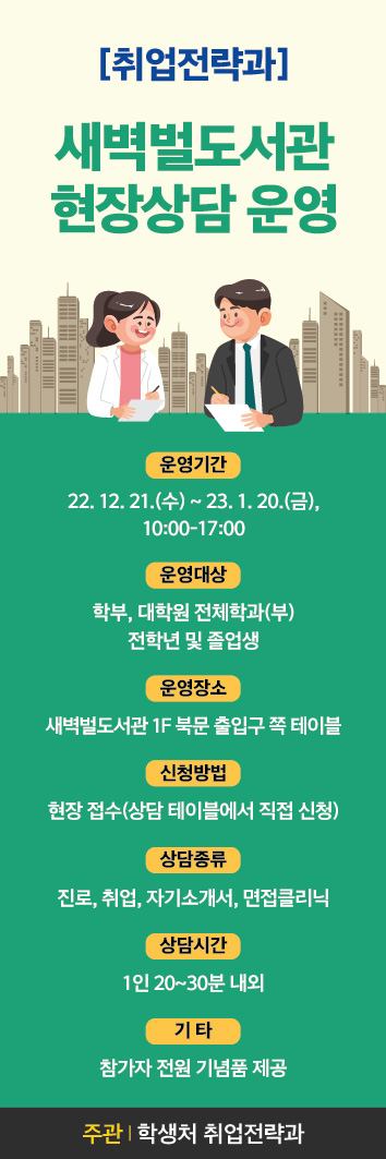 학생들의 이용도가 높은 새벽벌도서관에 현장상담 데스크를 운영하여, 학생들의 진로 및 취업준비를 지원하려 합니다. 학생들의 많은 관심과 참여를 바랍니다.