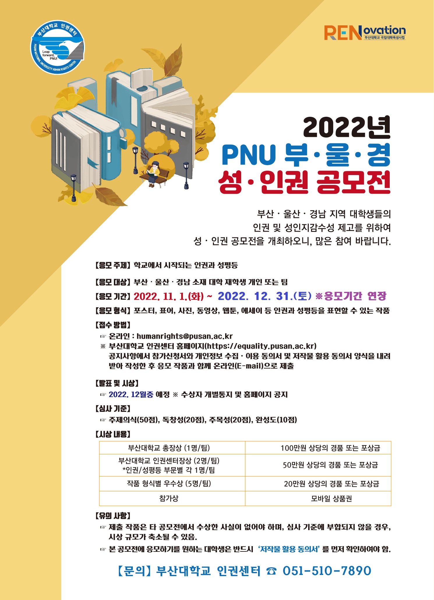 fnctId=bbs,fnctNo=2557 작성일 2022.12.12 수정일 2022.12.12 작성자 최지현 조회수 180 2022년 부.울.경 성.인권 공모전 안내 첨부파일 [REN] 『2022년 PNU 부·울·경 성·인권 공모전』 포스터(변경).jpg 미리보기
