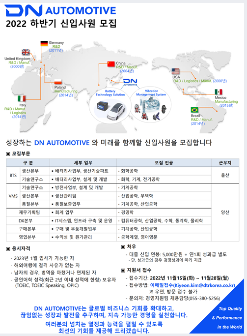 fnctId=bbs,fnctNo=11448 작성일 2022.11.15 수정일 2022.11.15 작성자 최지현 조회수 96 [DN AUTOMOTIVE] 2022 하반기 신입사원 모집 첨부파일 [수정](주)DN AUTOMOTIVE 2022년 하반기 신입사원 모집.pdf 미리보기 DN AUTOMOTIVE 입사지원서(신입).xls 미리보기